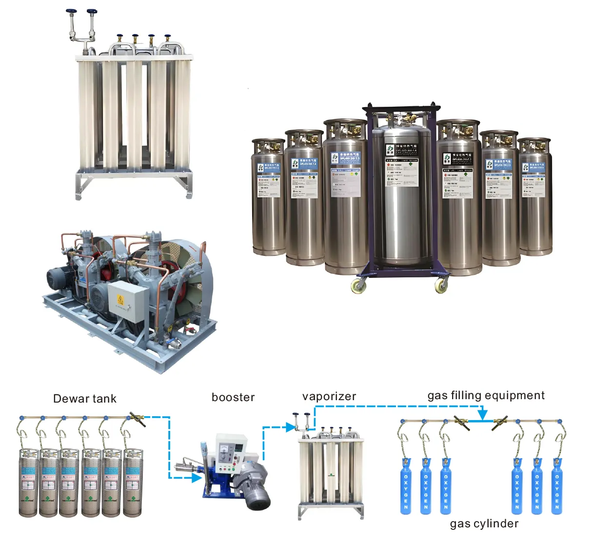 Amcaremed 극저온 액체 산소 저장 시스템에는 극저온 액체 산소 탱크, 극저온 액체 충전 실린더 펌프, 기화기, 가스 압력 조절 장치 및 충전 매니 폴드가 포함됩니다.